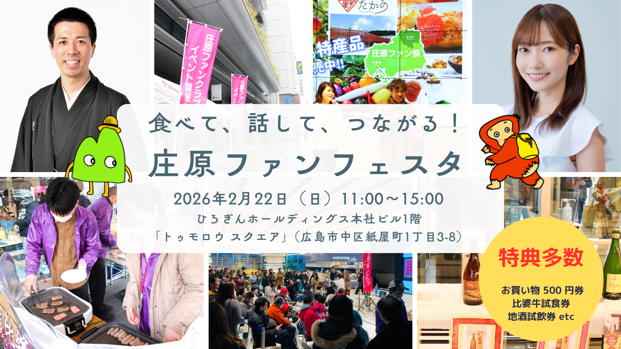 庄原が好きな人も、ちょっと気になっている人も、はじめましての人も。このイベントは、「すでに庄原のファンの人」も「これから関わってみたい人」も、気軽に庄原とつながれるファン交流イベントです。