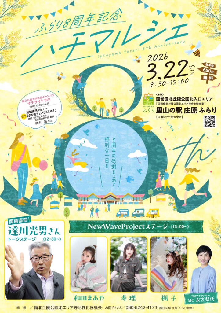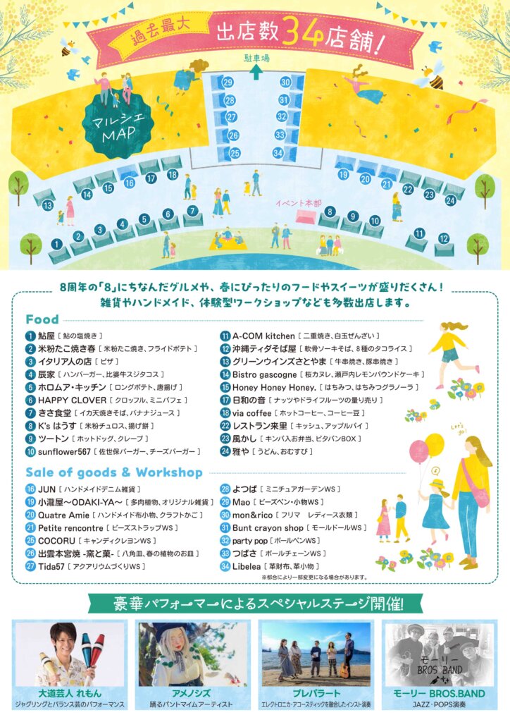 ふらり8周年を記念し「8」や「春」をテーマにした、おいしい食べ物やドリンクの出店、手作り雑貨やワークショップ、ステージイベントなどを開催します。